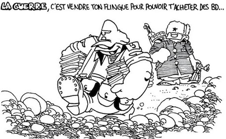 –Vaughn Bodé balance sa vision d’une guerre assez proche – 1945 à 1963 – avant que le conflit vietnamien ne matérialise la guerre froide sur les écrans de télévision (1965). Catalogue de scènes absurdes, Dăs KämpF se construit sur un modèle établi à l’époque par le Peanuts de Schulz et décliné comme suit : Le bonheur, c’est …